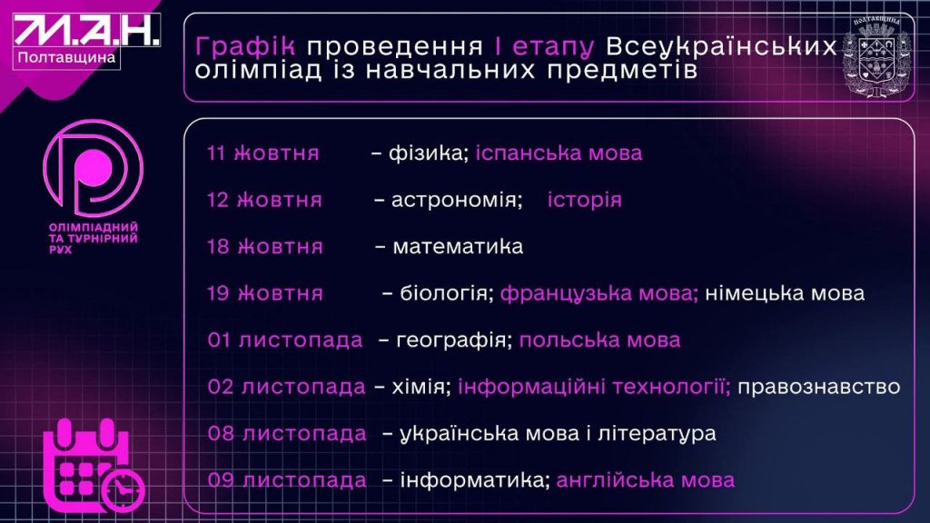 З 11 жовтня до 9 листопада 2025 року організовано проведено І етап учнівських олімпіад з 16 навчальних предметів серед учнів Полтавської міської територіальної громади.Згідно з умовами Положення про учнівський олімпіадний та турнірний рух на І етап зареєструвалося 1726 учасників-учнів закладів загальної середньої освіти Полтавської міської територіальної громади. Фактично взяли участь 1639 учнів, що складає 95% від зареєстрованих учасників.